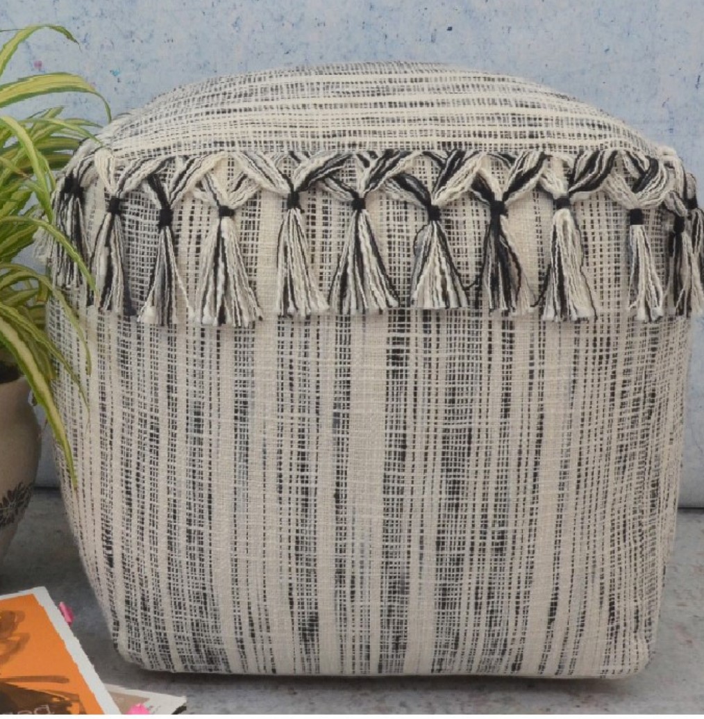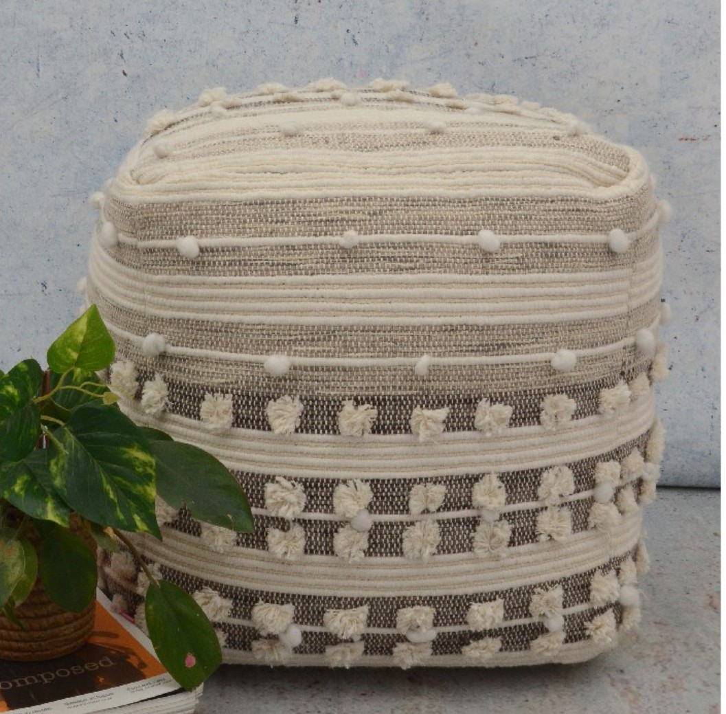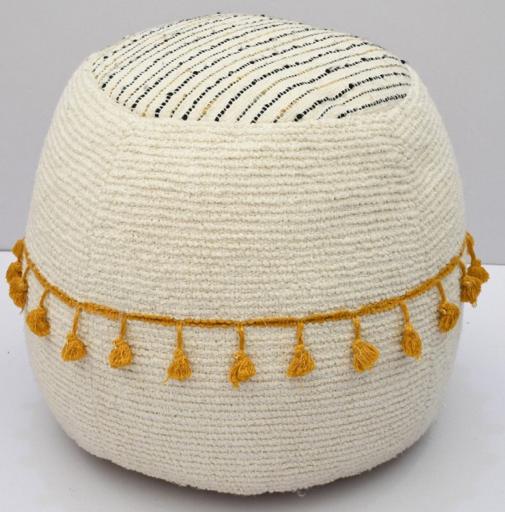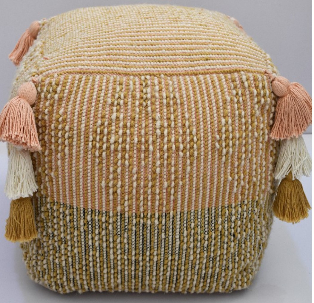 At Knots & Looms Overseas, woven poufs are developed using high‑quality materials such as cotton, wool, recycled yarns, and blended fibers. The handwoven outer structure is paired with durable, high‑density filling to ensure shape retention, comfort, and long‑lasting performance. Their sturdy construction makes them suitable for everyday use in both residential and hospitality environments.